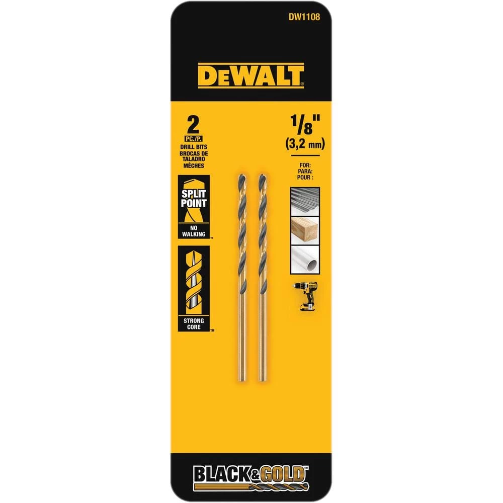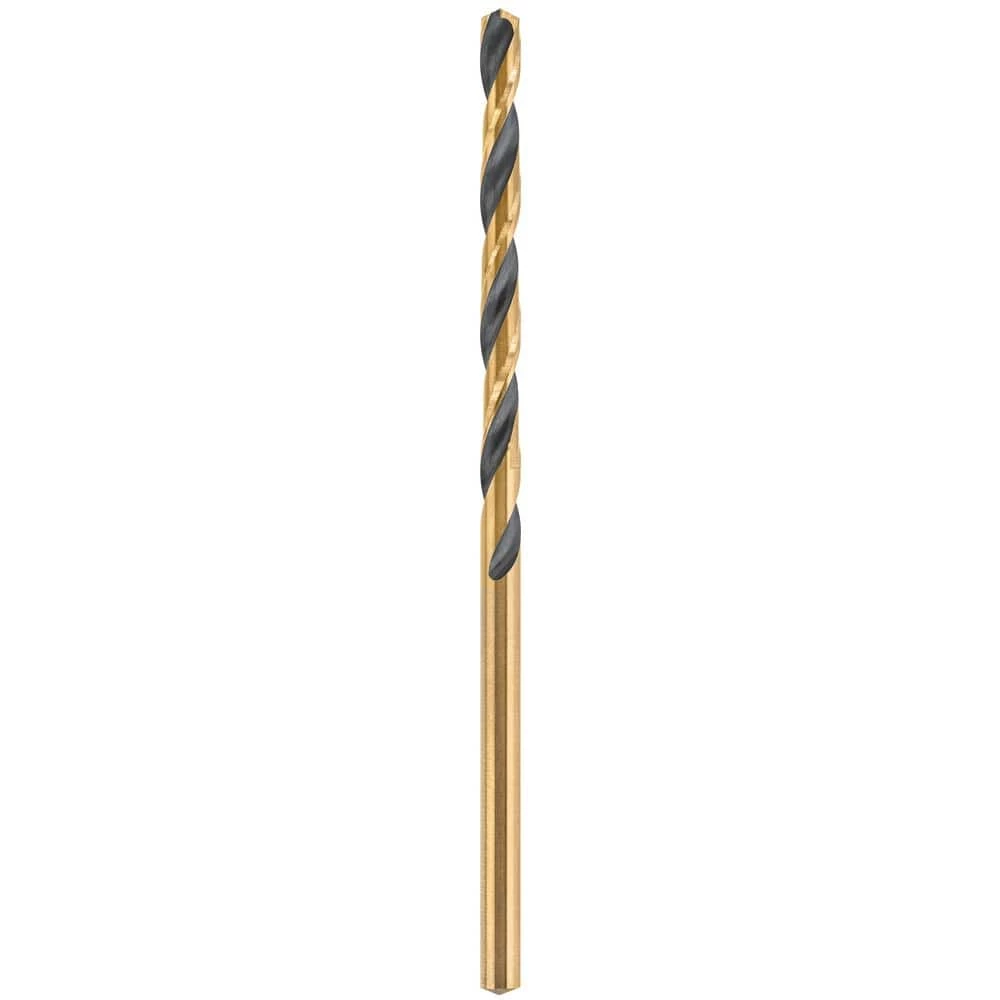 The DEWALT Black and Gold Metal Drill Bits feature a black and gold coating for preventing rust. The tapered web design provides extreme durability to resist breakage. The bits feature a 3-flats shank to reduce spin-out in the chuck and are made of heavy-duty High Speed Steel for drilling into a variety of materials including plastic, wood and metal. Each bit features a 135° split point tip design to help reduce walking.