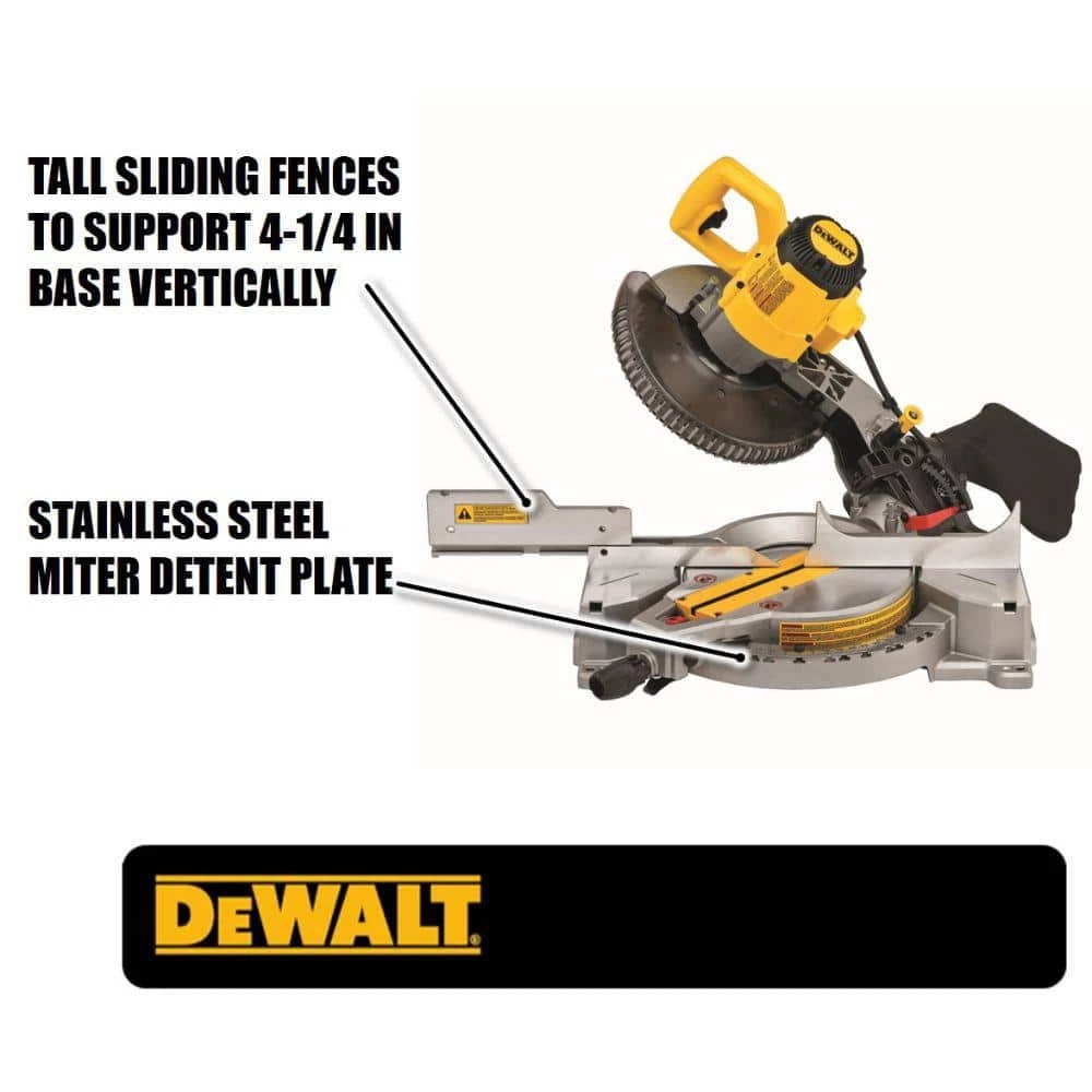 The DEWALT DWS713 10 in. Compound Miter Saw has a 15 Amp motor to drive 5,000 RPM, delivering extended power and durability. This 10-in miter saw features a stainless steel miter detent plate and miter lock knob with detent latch. This allows the miter saw to deliver repeatable accuracy and durability with easy adjustments. Tall sliding fences support 4-1/2 in. of crown molding vertically nested. Its lightweight design and built-in carry handle help make this a portable miter saw you can easily move around the jobsite. This 10-in compound miter saw is backed by DEWALT 3-year limited warranty for your additional peace of mind