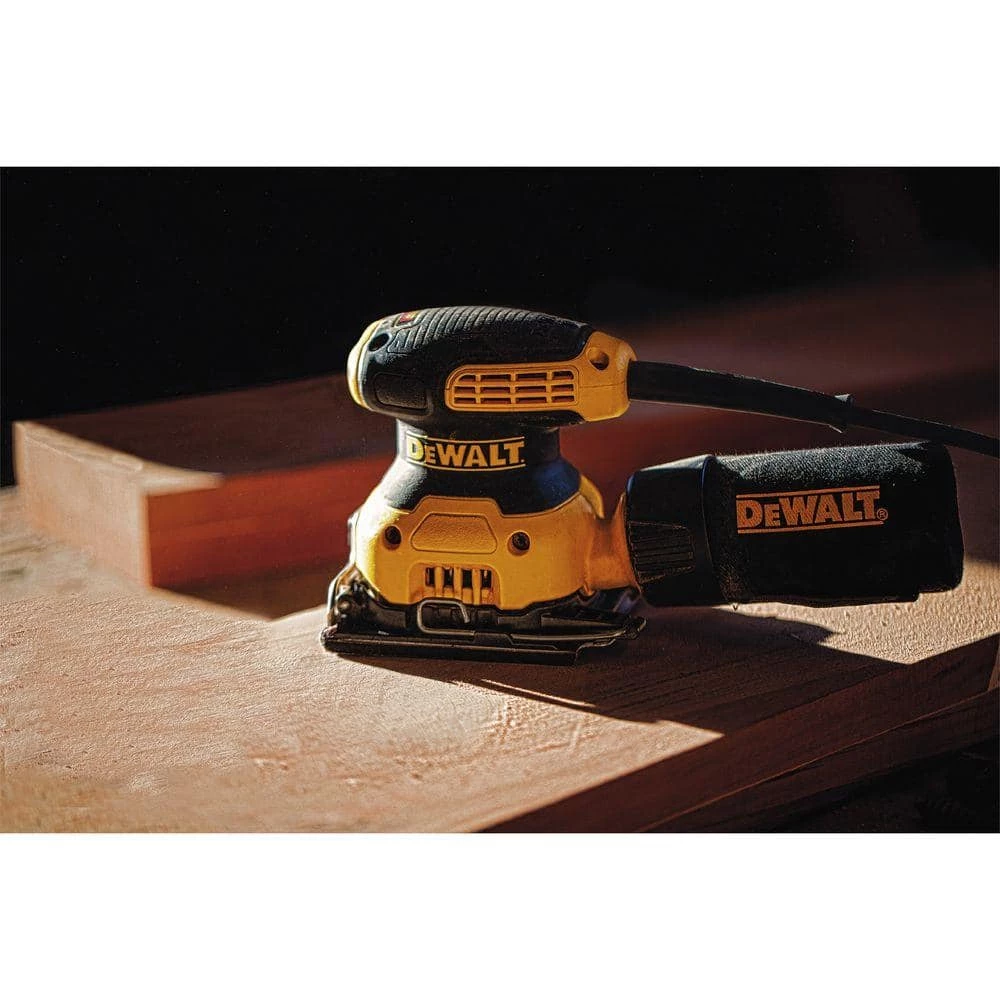 The DEWALT DWE6411K 1/4 Sheet sander combines many end-user driven features and benefits. We have reduced the overall height of the unit, while keeping a powerful motor. We have also been able to reduce the vibration and wobble for improved comfort when sanding. The new paper clamp system was created after feedback and frustration that users had with the current wire form system. The new system works with a front button and a paper tension system with the back paper clamps.