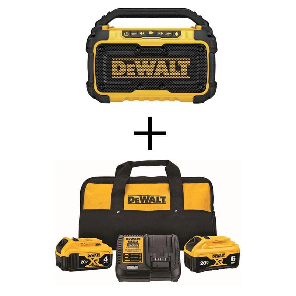 The DCR010 is designed to be the most versatile Bluetooth speaker on the market. The unit is able to run off DEWALT slide pack battery packs including 12-Volt, 20-Volt and FLEXVOLT packs. Can be run in AC current mode with provided power cord. This 20-Volt MAX starter kit DCB246CK includes a XR 6.0 Ah battery, a XR 4.0 Ah battery, 4 Amp charger and a kit bag.