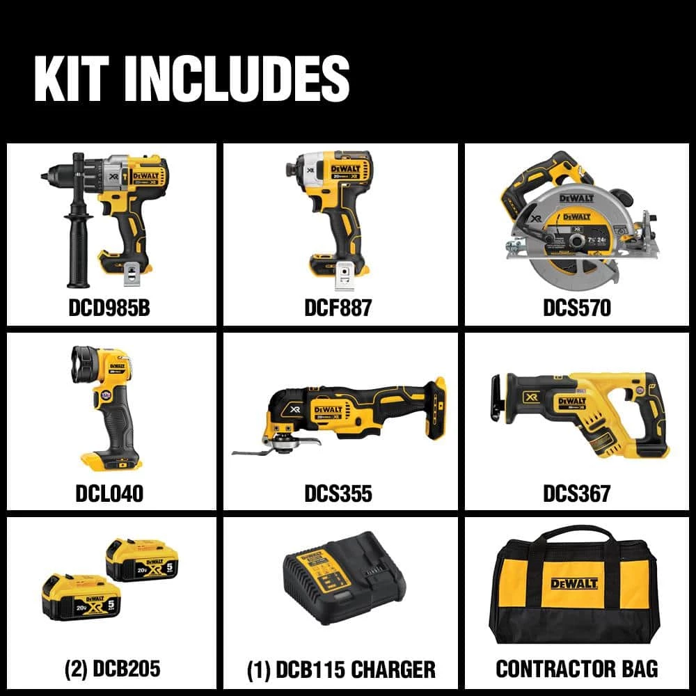 The DCK694P2 20-Volt MAX XR(R) 6-Tool Cordless Power Tool Combo Kit features our DCD996 Premium Hammer Drill/Driver with 3-speed transmission. It also has our DEWALT-built high-power, high-efficiency brushless motor that delivers up to 75% more runtime vs. 18-Volt NiCad brushed motors. The DCF887 20-Volt MAX XR (R)Brushless 1/4 in. 3-Speed Cordless Impact Driver is compact for fitting in tight spaces. Three LED lights make it ideal for working in dark or enclosed spaces. The DCS570 20-Volt MAX XR (R) Cordless Circular Saw features a brushless motor which provides 5200 RPM maintaining speed under load. The DCS367 20-Volt MAX XR (R) Cordless Reciprocating Saw features a compact and lightweight design to make your jobs easier. The DCS355 20-Volt MAX XR (R) Cordless Oscillating Multi-Tool has a powerful brushless motor providing up to 75% more run time over similar brushed tools. The DCL040 LED Worklight is a bright flashlight that illuminates your work area with an LED output of 110 lumens. This Cordless Power Tool Set is covered by a DEWALT 3-year limited warranty for your additional peace of mind.