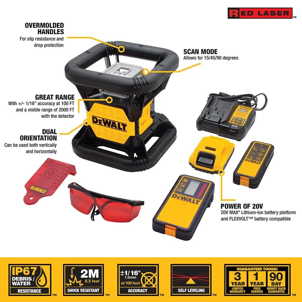 Great run times, Guaranteed Tough durability and the compatibility with a widely accepted battery platform are just a few of the things that make the DEWALT Red Rotary Tough Laser a must have tool for your job site. This Laser is ideal for Ideal for deck building, grading and foundations. This laser features scan mode of 15°/45°/90°.
