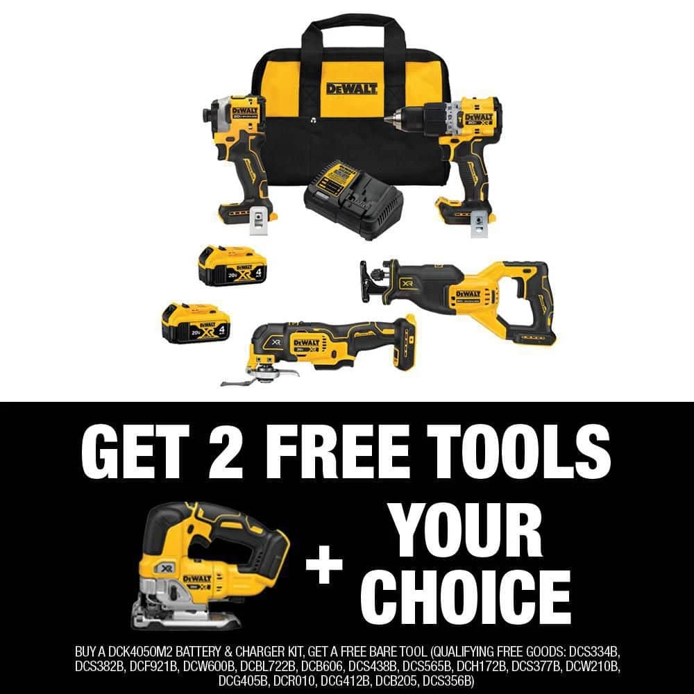 This 20V MAX Brushless 4-Tool Combo Kit includes one XR hammer drill/driver, ATOMIC Impact driver, XR oscillating multi-tool, XR reciprocating saw, two 4.0Ah batteries, charger and kit bag. The DCD805 hammer drill/driver is equipped with a 3-postion, pivoting LED for enhanced visibility in dimly lit work areas. At less than 4 in. in length, the DCF850 ATOMIC 20V MAX 1/4 in. Brushless 3-speed impact driver can handle a wide variety of applications without sacrificing power. The DCS382 reciprocating saw allows you to make quick cuts with the and change blades with ease using the twist-style keyless blade clamp. The DCS356 oscillating tool has 3-speeds to match your speed to application and works with most oscillating tool accessory brands. All tools included are backed by a 3-year limited warranty so you can buy with confidence. The DEWALT DCS334B 20-Volt MAX XR (R) Cordless Jigsaw features an efficient motor for powerful performance and extreme runtime.