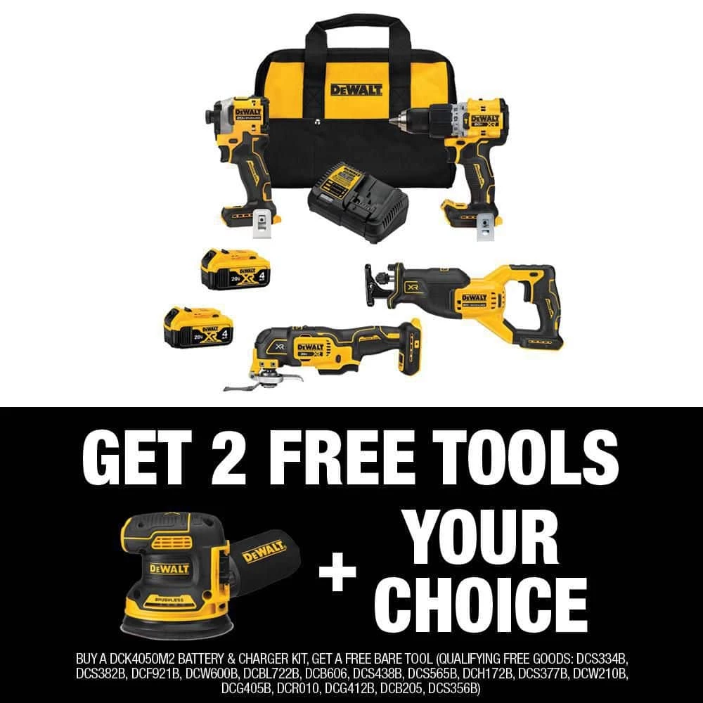 This 20V MAX Brushless 4-Tool Combo Kit includes one XR hammer drill/driver, ATOMIC Impact driver, XR oscillating multi-tool, XR reciprocating saw, two 4.0Ah batteries, charger and kit bag. The DCD805 hammer drill/driver is equipped with a 3-postion, pivoting LED for enhanced visibility in dimly lit work areas. At less than 4 in. in length, the DCF850 ATOMIC 20V MAX 1/4 in. Brushless 3-speed impact driver can handle a wide variety of applications without sacrificing power. The DCS382 reciprocating saw allows you to make quick cuts with the and change blades with ease using the twist-style keyless blade clamp. The DCS356 oscillating tool has 3-speeds to match your speed to application and works with most oscillating tool accessory brands. All tools included are backed by a 3-year limited warranty so you can buy with confidence. Our 20V MAX XR Brushless 5 in. Cordless Random Orbital Sander DCW210B provides you with the power and runtime needed to get the job done.