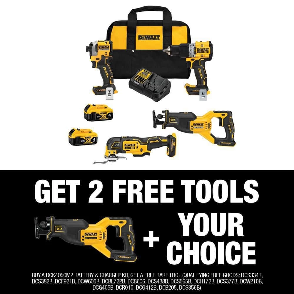 This 20V MAX* Brushless 4-Tool Combo Kit includes one XR hammer drill/driver, ATOMIC Impact driver, XR oscillating multi-tool, XR reciprocating saw, two 4.0Ah batteries, charger, and kit bag. The DCD805 hammer drill/driver is equipped with a 3-postion, pivoting LED for enhanced visibility in dimly lit work areas. At less than 4 in. in length, the DCF850 ATOMIC 20V MAX* ¼ in. Brushless 3-speed impact driver can handle a wide variety of applications without sacrificing power. The DCS382 reciprocating saw allows you to make quick cuts with the and change blades with ease using the twist-style keyless blade clamp. The DCS356 oscillating tool has 3-speeds to match your speed to application and works with most oscillating tool accessory brands. All tools included are backed by a 3-year limited warranty so you can buy with confidence. From light construction to demolition, the 20-Volt MAX. XR Brushless Cordless Reciprocating Saw DCS382B delivers the cutting power and maneuverability needed by pros like you for challenging projects.