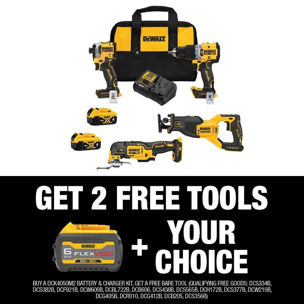 This 20V MAX* Brushless 4-Tool Combo Kit includes one XR hammer drill/driver, ATOMIC Impact driver, XR oscillating multi-tool, XR reciprocating saw, two 4.0Ah batteries, charger, and kit bag. The DCD805 hammer drill/driver is equipped with a 3-postion, pivoting LED for enhanced visibility in dimly lit work areas. At less than 4 in. in length, the DCF850 ATOMIC 20V MAX* ¼ in. Brushless 3-speed impact driver can handle a wide variety of applications without sacrificing power. The DCS382 reciprocating saw allows you to make quick cuts with the and change blades with ease using the twist-style keyless blade clamp. The DCS356 oscillating tool has 3-speeds to match your speed to application and works with most oscillating tool accessory brands. All tools included are backed by a 3-year limited warranty so you can buy with confidence. The DEWALT DCB606 FLEXVOLT Battery pack changes voltage when you change tools.