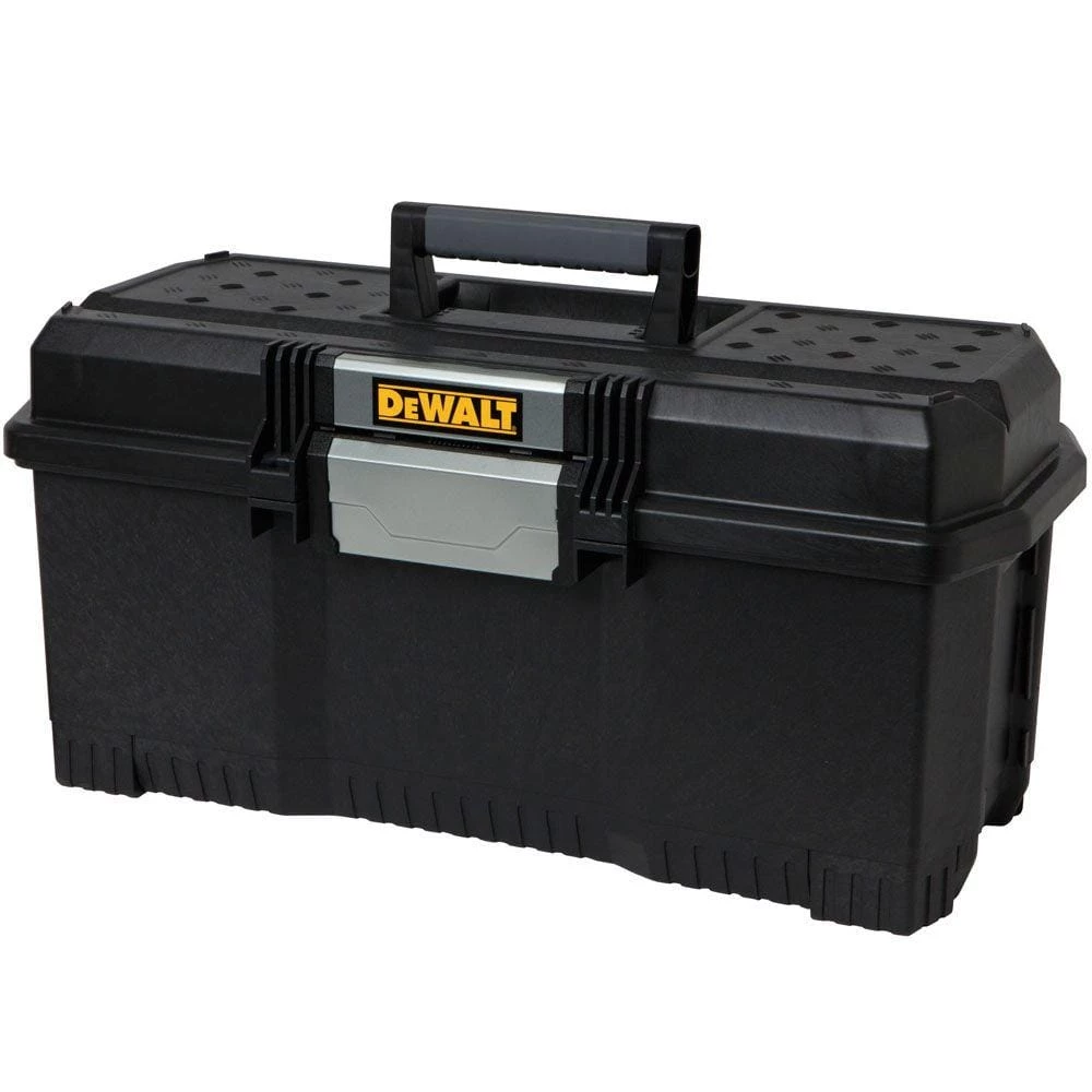 The DEWALT 24 in. 1-Touch Tool Box holds up to 3,064 cu. in. and up to 55 lbs. for storage of home or work tools. The box has resin construction with a water seal to help provide water resistance. This unit features a large storage compartment that is ideal for carrying power tools, hand tools and medium-to-large items and it features a portable 1/2 tray to accommodate large objects.