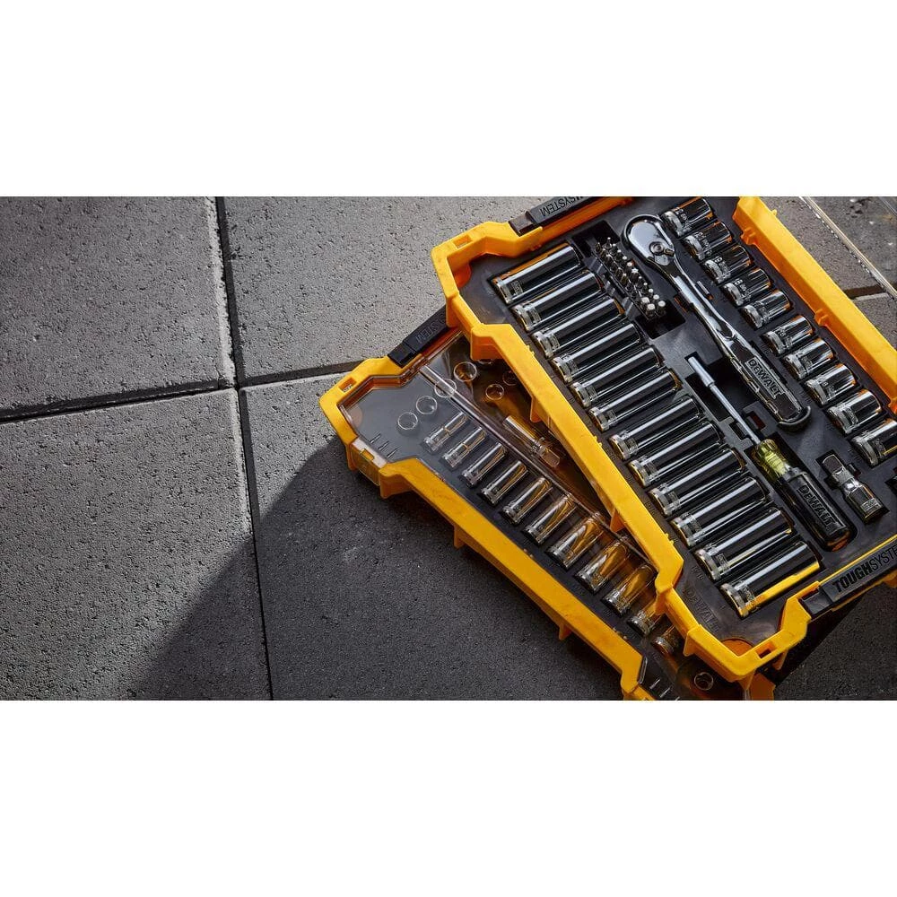 This 85-Piece Mechanics Set includes a wide selection of sockets, socket accessories and Bits to help complete a variety of tasks. The set is sold inside the 2 TOUGHSYSTEM 2.0 Shallow Tool Trays, along with a molded inserts and compatible lids for optimal storage and transportation. This set includes a durable 72-tooth ratchet wih 5° arc swing for maneuverability in restricted areas. Full-polish chrome provides corrosion resistance and gives these tools a classic look.