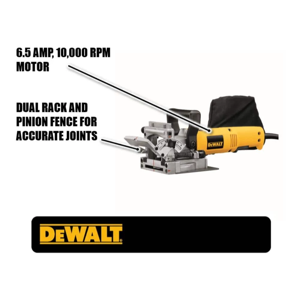 This DW682K Heavy-Duty Plate Joiner Kit is powered by a 6.5 Amp 10,000 RPM motor for working with hard woods. This plate joiner features a dual rack and pinion fence that ensures blade and fence are always parallel for accurate joints every time. The integral one-piece fence is adjustable allowing the user to tilt it from 0-90°. With this DEWALT plate joiner, you can also make flush cuts at 0° without needing to remove the fence. The non-marring, heavy-duty aluminum shoe allows the user to clamp the plate joiner for stationary work.