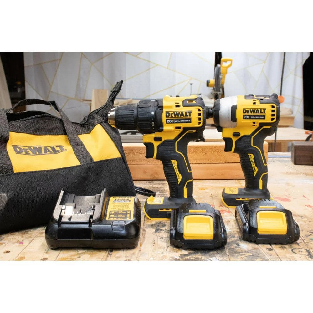 - Includes (1) DEWALT DCD708B ATOMIC 20-Volt MAX compact 1/2 in. cordless drill/driver, (1)DEWALT DCF809B ATOMIC 20-Volt MAX compact 1/4 in. cordless impact driver, (2) 20-Volt MAX lithium-ion 1.3 Ah battery packs, 20-Volt MAX charger and contractor bag