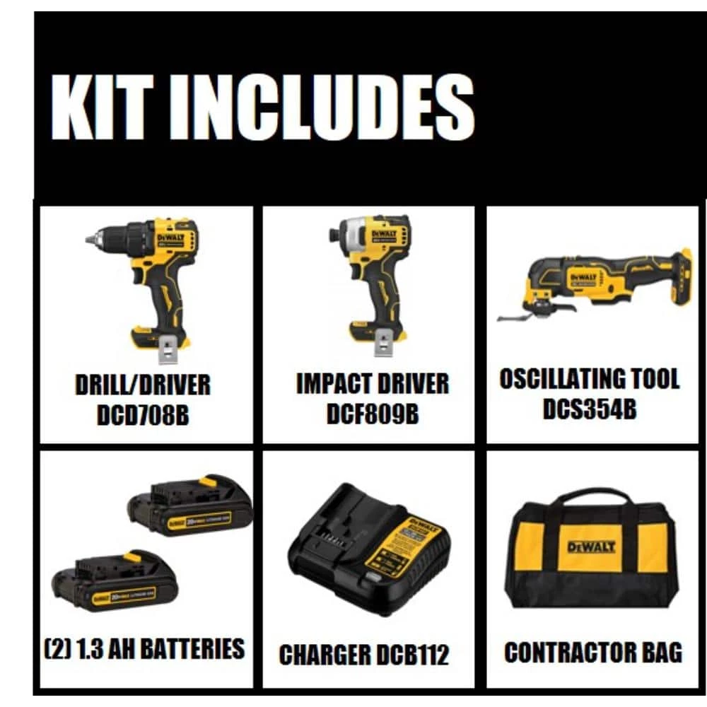 - Includes (1) DCD708B ATOMIC 20-Volt MAX compact 1/2 in. drill/driver, (1) DCF809B ATOMIC 20-Volt MAX compact 1/4 in. impact driver, (2) 20-Volt MAX lithium-ion 1.3 Ah battery packs, 20-Volt MAX charger and contractor bag and (1) DCS354B Cordless Oscillating tool