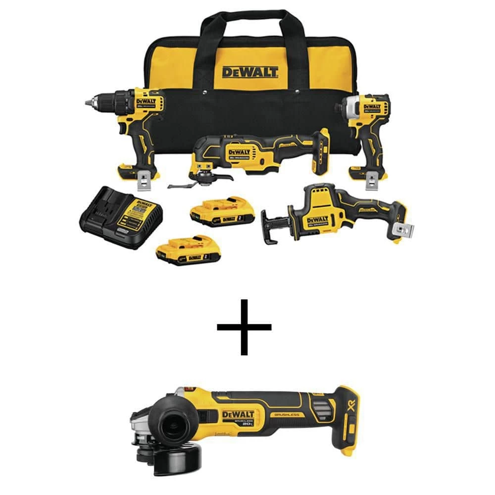 This ATOMIC Compact Series 20-Volt MAX Cordless Combo Kit includes one 1/2 in. Drill/Driver, 1/4 in. Impact Driver, 1-Handed Reciprocating Saw, Oscillating Multi-Tool, charger, kit bag and two 20-Volt MAX 2.0 Ah batteries. The DCD708 Drill/Driver is compact at only 6.3 in. front to back and its high-performance brushless motor delivers 340 unit watts out (UWO). The DCF809 Impact Driver features a high-performance brushless motor that delivers 1,700 in. to lbs. of max torque. The DCS354 Oscillating Multi-Tool has a DUAL-GRIP variable-speed trigger that provides increased speed and application control. The DCS369 1-Handed Reciprocating Saw is lightweight at only 3.13 lbs., making it 37% lighter than the DCS367 Compact Reciprocating Saw (Tool Only). For a limited time get a 20-Volt MAX XR Cordless Brushless 4-1/2 in. Slide Switch Small Angle Grinder with Kickback Brake (Tool-Only) with purchase.