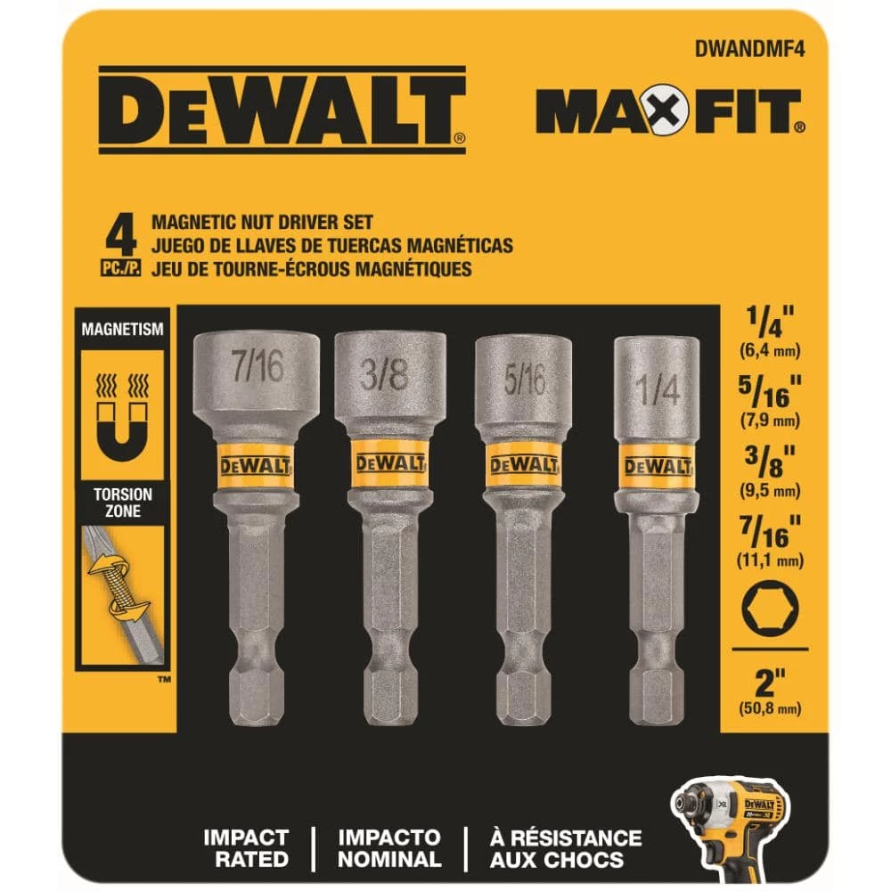 DEWALT MAXFIT Nut Drivers are engineered for use with Impact Drivers. They feature an industrial strength magnet for fastener retention. Their recessed corner design makes the fastener drive on the flats minimizing the build up of metal shavings and reduce rounding of the hex head.