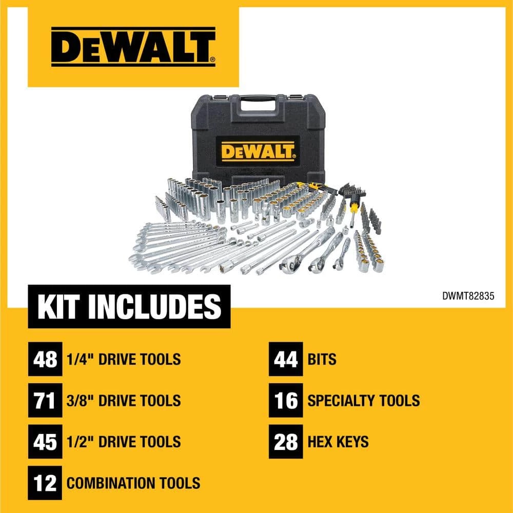 This 264-piece. Mechanics Tool Set includes 3 ratchets and sockets, a bit drive/specialty bits, socket bits nut bits, combination wrenches and hex keys to handle most jobs under the hood or elsewhere. A durable case featuring metal latches provides organization and easy storage for travel. The 72 tooth count ratchets are built for efficiency with a quick-release button to easily attach and remove sockets. These tools feature a full polish chrome finish for corrosion resistance.