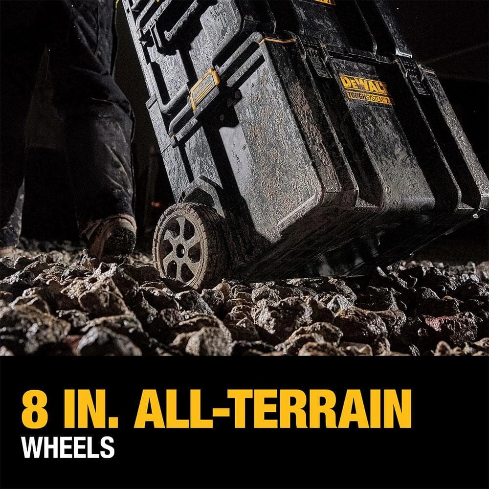 The TOUGHSYSTEM 2.0 Mobile Tool Box has patented auto-connect side latches, allowing for 1 hand operation. It also has 2-piece metal wire front latches for added durability when securing tools inside of the box. This tool box offers 20% more tool storage when used with DWST08165 and DWST08300 as part of a tower. It is IP65 rated for dust and water resistance and has a 250 lbs. load capacity. The tool box has a removable inner tray for optimal organization. The wheel of this toolbox is 8 in. to navigate through worksite terrain. The TOUGHSYSTEM 2.0 Mobile Tool Box is compatible with all TOUGHSYSTEM products.